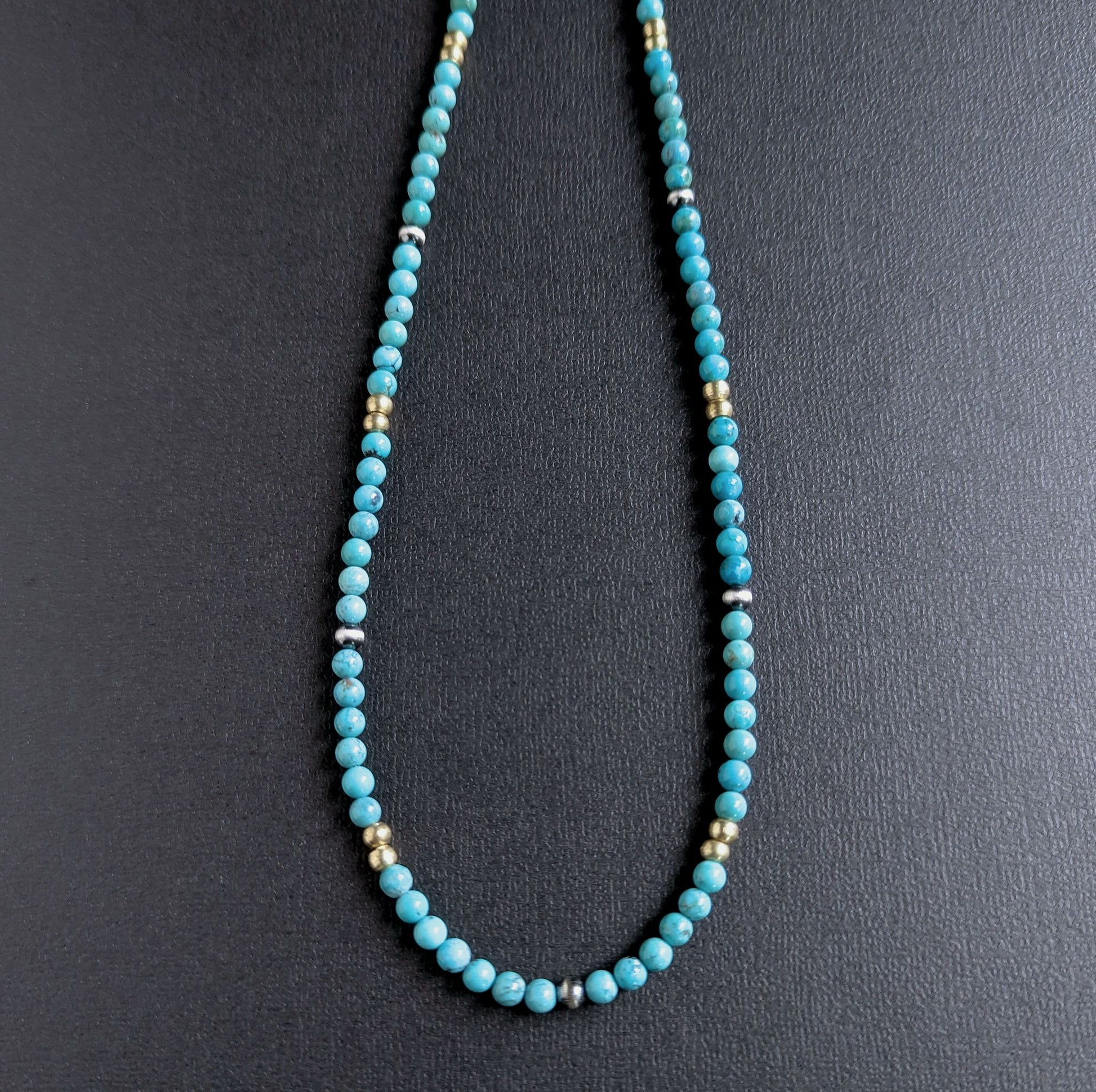 A string of small, vibrant blue AAA grade genuine turquoise beads is mixed with brass and sterling silver beads for this striking men’s necklace.