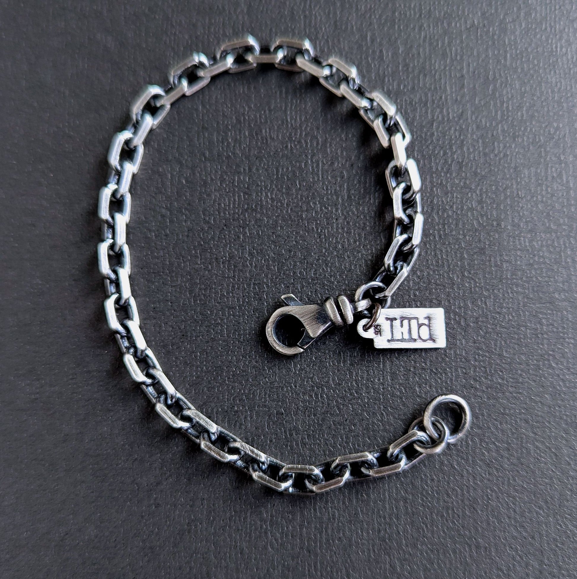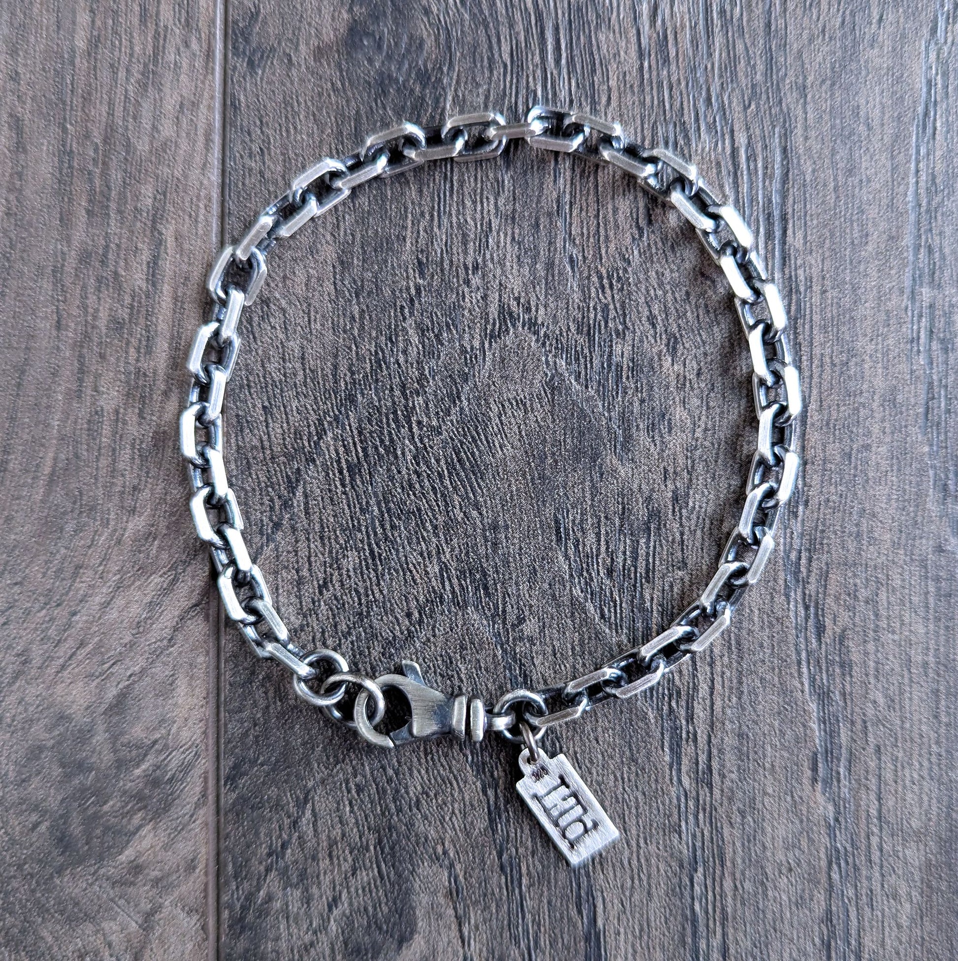Diamond cut sterling silver links with beveled edges makes a cool, sturdy chain bracelet for men. A large swivel lobster clasp secures it. Chain has been oxidized and sanded for rustic appeal. Great for stacking!