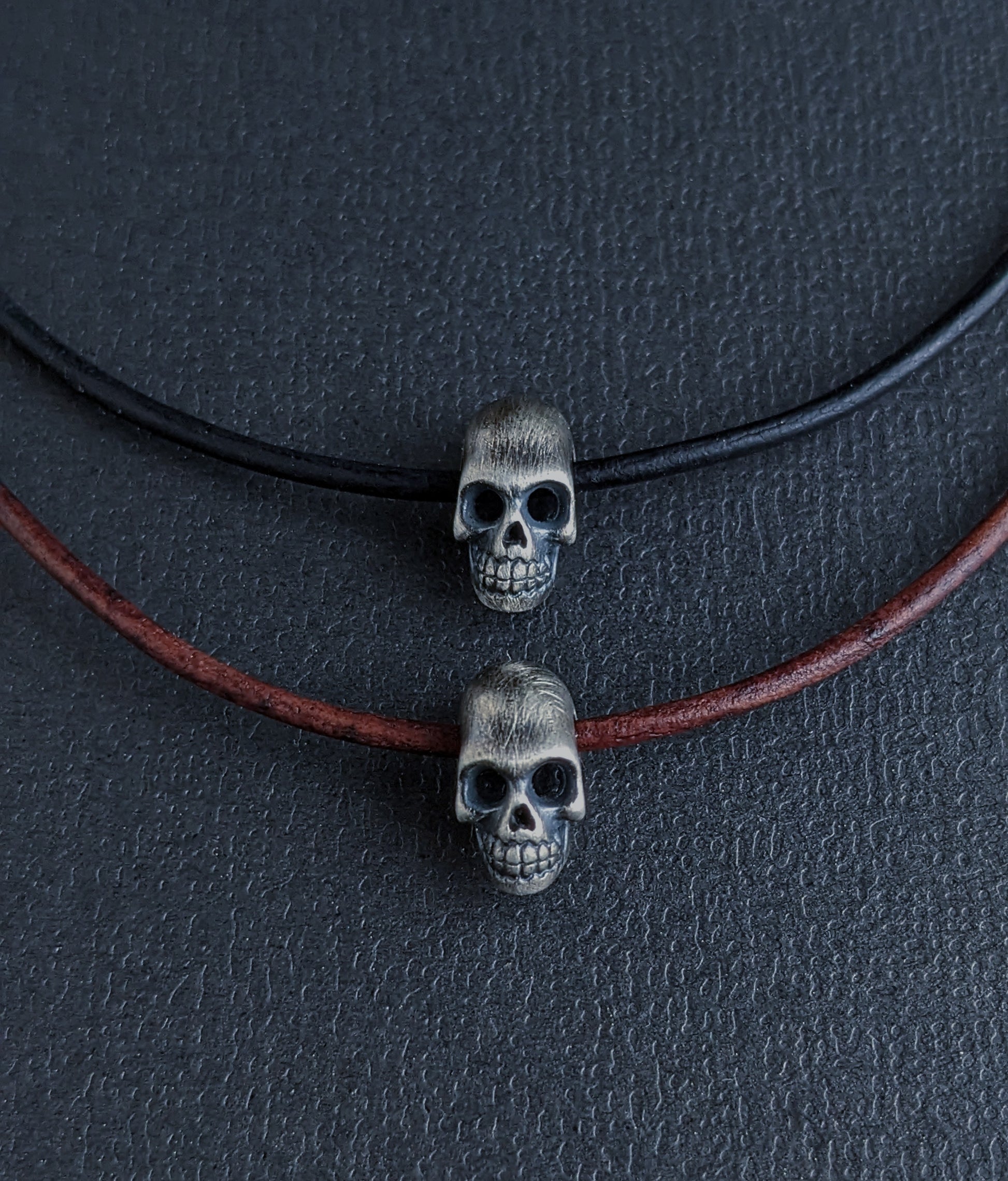 Thin leather cord, in your choice of black or brown, threads through a detailed sterling silver skull bead for this men’s simple choker style necklace. It’s secured with oxidized sterling silver end caps and a lobster clasp.